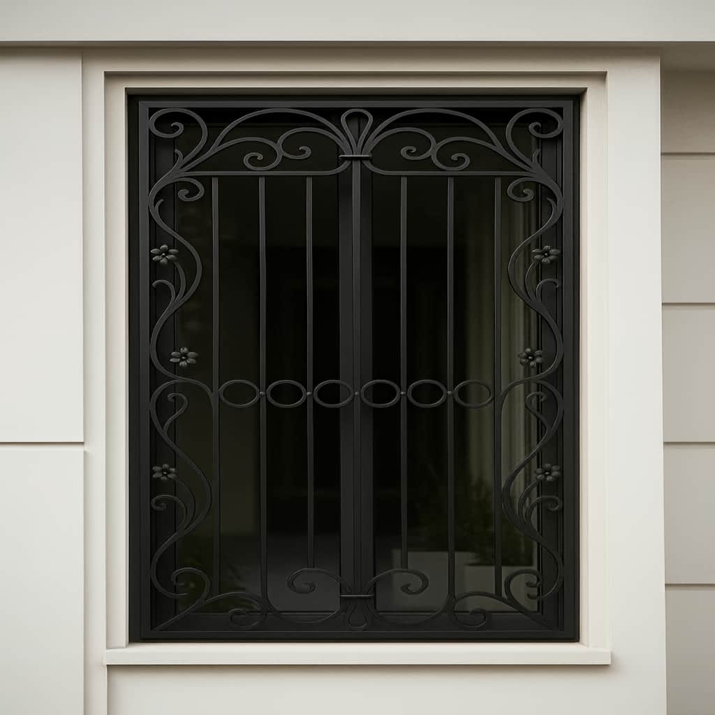 حفاظ پنجره مدل پیچک بهاری فرفورژه ترکیب فرفورژه نقش پذیر با نقش های برگ وار؛ رنگ کوره ای الکترواستاتیک و اتصال CO2 برای دوام و امنیت در باغ ویلا و نمای کلاسیک.